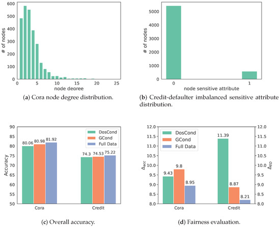 Empirical evaluation on the Cora and Credit-defaulter datasets. For Cora, we used node degree to split the subgroups. For Credit, we used the node attribute Age. (a): The node degrees of Cora follow a long-tail distribution. (b): The Credit dataset was highly imbalanced regarding a specific attribute. (c): GCond and DosCond yielded comparable overall accuracy on both datasets. (d): GCond and DosCond resulted in a larger disparate impact for GNNs when compared to training on the original full data.