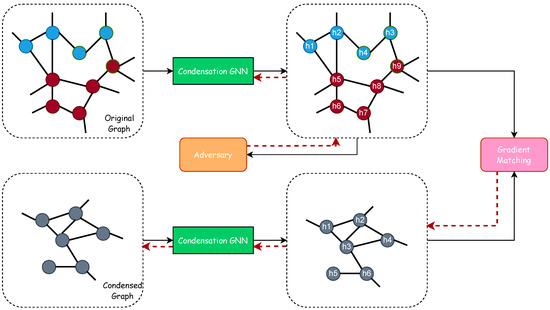 Framework of our method. At each iteration, both the original graph and condensed graph were fed to the condensation GNN, which is regularized by the proposed adversary term. Red dotted lines indicate a backward gradient.