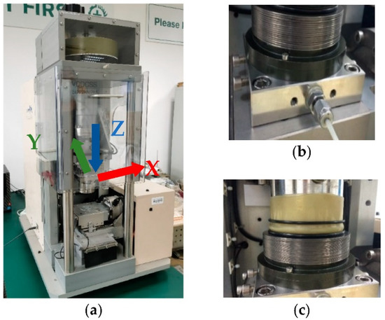 This study used the Variable Direction Dynamic Cyclic Simple Shear (VDDCSS) system for simple shear tests, as shown in Figure 1a, which is capable of applying shear stresses in any direction on the horizontal plane by combining two perpendicular shear motors. In our experiments, a cylindrical sample with a diameter of 70 mm and a height of 17 mm (after consolidation) was used, which had a large diameter-to-height ratio (D/H = 4.12) and can reduce the non-uniformity of stress and strain in the specimen [6,15]. The VDDCSS used two drainage lines to control drainage conditions, and the radial constraint was composed of multiple Teflon coated rings, 1 mm high each, and their stiffness meet the requirement of a K0-consolidated condition, as shown in Figure 1b,c.