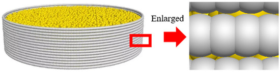 The particle diameter in DEM was generated according to the above characteristics, including particle size, elongation index, and convexity. To simulate the shape of particles, a particle sample was constructed using a clump element, as shown in Figure 6. The shape was generated based on the elongation index and flatness index of the tested material, the measured 3D sphericity mean value was 0.85. The 3D roundness mean value was reflected via contact parameters. To simplify the simulation, all particles in DEM used the same particle sample.