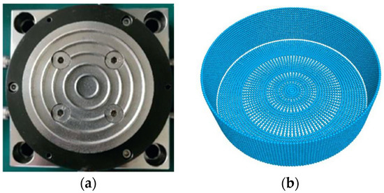 In undrained simple shear tests, specimens were sheared by horizontally moving the bottom plate while the top plate was fixed in all directions. In the DEM model, samples were sheared in the same fashion. In the experiment, in order to increase the friction between the bottom plate and particles, several circular ridges were used on the contact surfaces, as shown in Figure 4a. In order to model the ridges and large friction, this study used a clump plate, as shown in Figure 4b.