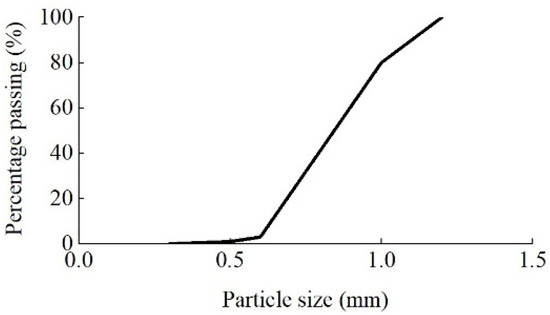 The tested material was Leighton Buzzard (Fraction B) sand, with a diameter between 0.6 to 1.2 mm and a mean diameter of 0.82 mm, and its effective grain size was 0.65 mm. Its uniformity coefficient was 1.38 [22]; the particle grading curve is shown in Figure 5. The emax and emin of the sand used in the laboratory test were 0.79 and 0.46, respectively. The Leighton Buzzard sand consisted of sub-rounded sand particles, and had relatively smooth surfaces. It had a 3D sphericity mean value of 0.92, a 3D roundness mean value of 0.65, an elongation index of 0.80, and a flatness index of 0.78.