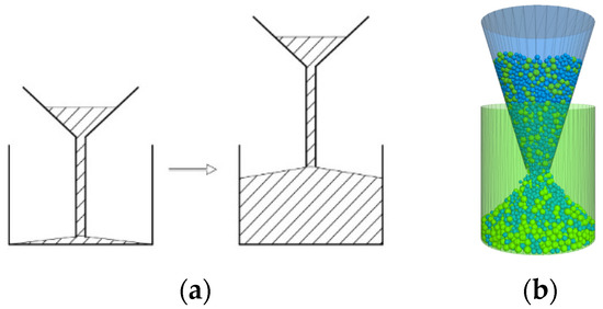Sample preparation process with dry funnel method: (a) laboratory test and (b) DEM model.
