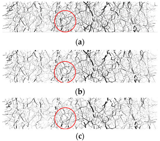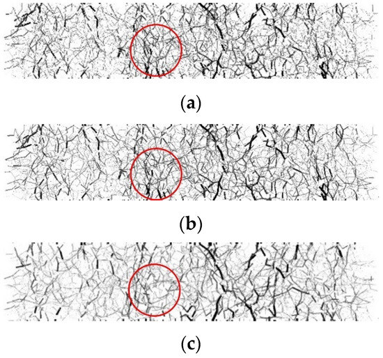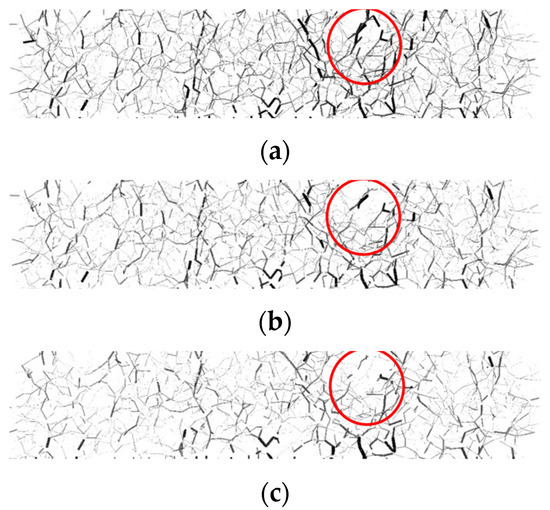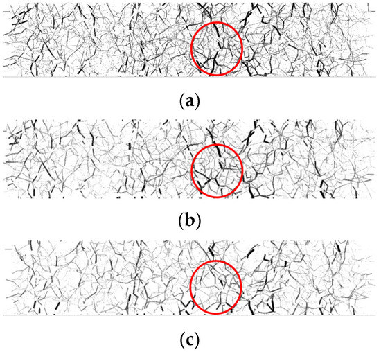 Contact force chain of SL series: (a) SL-0.1-0; (b) SL-0.1-45; and (c) SL-0.1-90.