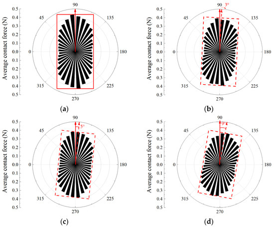 Compared to the initial vertical stress, the consolidation shear stress applied in this study was not significant, so the contact force had a limited change of direction at the end of the first cycle. To analyze the influence of the directions of consolidation shear stress on contact force between particles, the test results of the sample with CSR = 0.1 are summarized in Figure 18, which show the distribution of average contact force for SL-0.1-0, SL-0.1-45, and SL-0.1-90 at the end of the zeroth and first cycles.