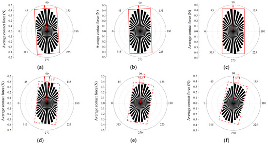 Distribution of average contact force of SL-0.1 series: (a) after consolidation of sample SL-0.1-0; (b) after consolidation of SL-0.1-45; (c) after consolidation of SL-0.1-90; (d) first cycle of SL-0.1-0; (e) first cycle of SL-0.1-45; and (f) first cycle of SL-0.1-90.