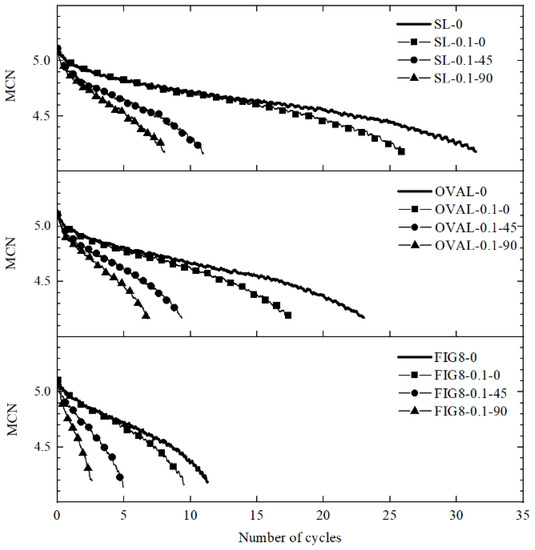 Figure 19 showed the evolution of the mechanical coordination number of cyclic simple shear tests. The MCN of all samples decreased rapidly at the beginning and the end of shearing, but the curve was relatively flat in the middle. The MCN was about 4.2 when samples were liquefied. In samples with different shear paths, the evolution of the MCN of the SL series and OVAL series was similar, while the MCN changed significantly in the FIG8 series. In the FIG8 series, the MCN decreased faster, resulting in fewer skeleton particles and faster liquefaction. When the shear path was the same, as θ increased, the number of contacts between each particle decreased, the number of floating particles increased, and the MCN dropping rate increased.