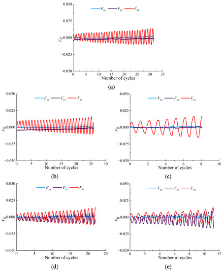 Evolution of Fxy, Fxz and Fyz: (a) SL-0; (b) SL-0.1-0; (c) SL-0.1-90; (d) OVAL-0; and (e) FIG8-0.