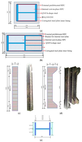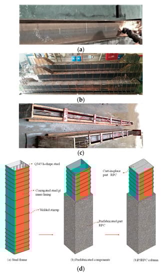 In this study, a new type of PSRPC column is designed. The idea was to first fabricate a prefabricated RPC shell in the factory, which consisted of an external RPC, hoop reinforcement and an internal H-beam. Corrugated steel plates were welded to the flanks of the internal H-beam to form the internal cavity. The precast RPC shell was then maintained to the required strength, transported to the construction site and assembled before the internal RPC was poured to form the complete PSRPC column, thereby compensating for the complex assembly and poor integrity of conventional fully precast steel and concrete columns. In the PSRPC column, the precast shell is made of high-performance reactive powder concrete with good durability, while the internal cast-in-place concrete can be designed as a hollow section with plain concrete or uncast concrete.