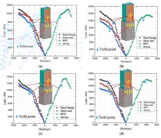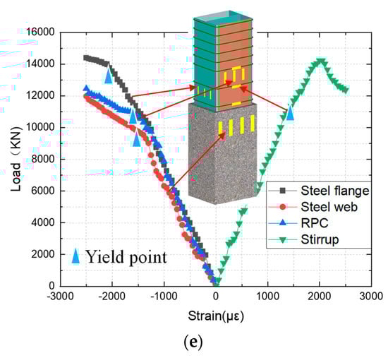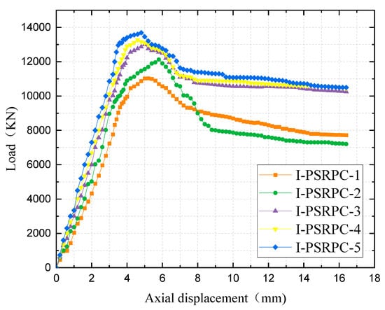 The load–displacement curves of the axially compressed specimens are shown in Figure 4. In the elastic stage, the specimen is slightly deformed, the displacement changes linearly with increasing load, and only a few cracks appear at this time. When the load reaches 75% Pmax, the specimen enters the elastoplastic state, the stiffness of the specimen decreases, the displacement increases faster and the load–displacement relationship becomes nonlinear. When the load reaches Pmax, the specimen enters the damage phase, the section yields, and the load carrying capacity of the specimen begins to decrease. Figure 5 shows the relationship between the load and the strains in the section flange, section web, RPC and hoop. The section flange and web reach their yield stress before Pmax, and the hoop bar yields close to Pmax, indicating that the hoop bar plays an important role in the ultimate stage. The load–strain relationship curves for the section flange, section web and RPC are approximately the same, indicating that the section and RPC may act in concert.
