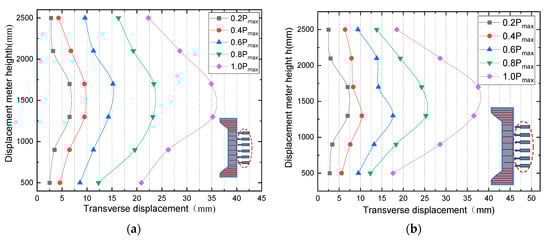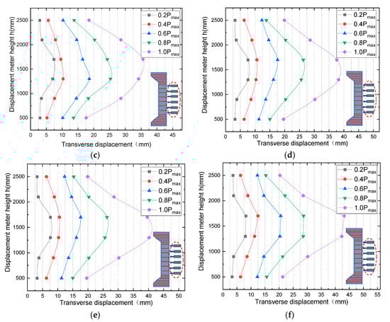 Figure 6 shows the load–transverse displacement curves for each point of the deflected specimen, from which the transverse displacements at each point are symmetrically distributed along the cross section in the column towards the ends. The greater the eccentricity is, the greater the transverse displacement of the specimen. Figure 7 shows the relationship between the eccentric load and the transverse displacement in the middle of the specimen. The higher the steel content is, the higher the ultimate displacement of the specimen. The eccentricity has a significant effect on the ultimate load capacity of the specimen; the higher the eccentricity is, the lower the ultimate load of the specimen. For II-PSRPC-1 and II-PSRPC-4, II-PSRPC-2 and II-PSRPC-5, and II-PSRPC-3 and II-PSRPC-6, the steel content and RPC strength. The eccentricity increases from 0.4 to 0.6 with the same grade, and the ultimate load decreases by 27.07%, 25.14%, and 24.55%, respectively.