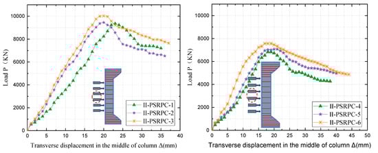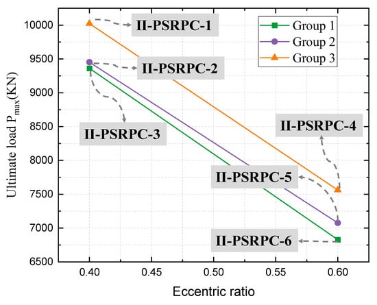 The ultimate load capacity of the two groups of specimens is shown in Figure 10, which shows that the eccentricity has a significant effect on the ultimate load capacity of the specimens. From the damage characteristics, the lateral displacement in column II-PSRPC-1 was 35.2 mm when the ultimate load capacity was reached, and the lateral displacement of II-PSRPC-1 was 35.2 mm when the ultimate load capacity was reached. The damage pattern of the specimens did not differ much, but the ultimate loads did vary considerably. The greater the eccentricity, the greater the width of the main crack and the greater the number of cracks in the specimens.