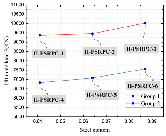 Batch II eccentric specimens II-PSRPC-1, II-PSRPC-2 and II-PSRPC-3 have the same cross-sectional dimensions, eccentricity and RPC strength class and contain 4.1%, 6.4%, and 8.7% steel, respectively. The same is true for specimens II-PSRPC-4, II-PSRPC-5 and II-PSRPC-6. As shown in Figure 9, the ultimate load of the specimens increases with increasing steel content. The slope of the rising section of the load–displacement curve of the deflected specimen increases as the steel content increases, the displacement increases at a slower rate and the load capacity decreases at a slower rate, as shown in Figure 7. As the thickness of the steel section increases, the contact surface between the section and the RPC increases, which improves the chemical bond between the section, and the RPC and increases the restraint effect of the section and the hoop on the RPC in the core area, thus increasing the stiffness and ductility of the specimen. Figure 9 shows that increasing the steel content improves the load bearing properties of the specimen but is not the most important factor affecting the load bearing capacity.