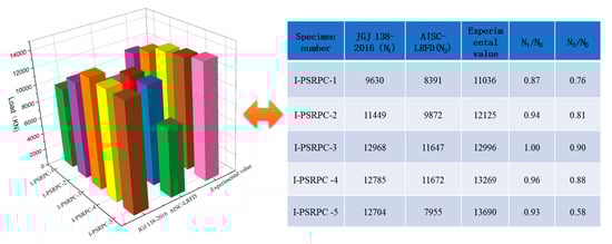 In accordance with the specifications JGJ 138-2016 [22] and AISC-LRFD [23], the positive section compressive load bearing capacity of the PSRPC axial compression column was calculated, and the comparison between the calculated results and the test results is shown in Figure 11. The calculation results of our code JGJ 138-2016 [22] are closer to the test values, and the calculation results of both codes are on the conservative side.