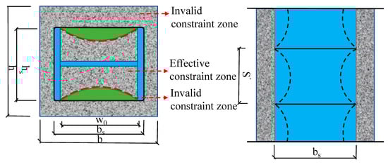 The calculation methods in the existing codes do not take into account the effect of restraint on the force performance of concrete. Mander [24] considered that hoop bars have a lateral restraint on concrete, which can put concrete in a three-way compressive stress state and can improve the axial compressive strength of concrete. His proposed model of hoop-constrained concrete columns considers that the restraint boundary curve in the plane of hoop-constrained concrete and between the hoop bars on both sides is parabolic, assuming an initial angle of 45 degrees. According to the lateral restraint action, the concrete can be divided into two different zones—the invalid constraint zone and the valid constraint zone [25]—as shown in Figure 12.