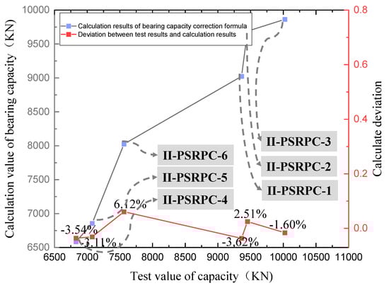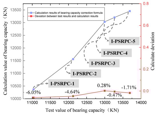 As shown in Figure 13, the test results of the axial compression specimens were compared with the calculated results according to Equations (3)–(13). The results show that the deviation between the test results and the calculation results of the modified formula is within 10%, and the modified formula considering the hoop restraint effect can predict the ultimate load capacity of such specimens more accurately.