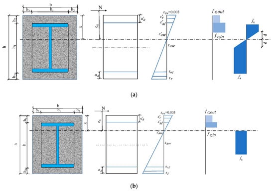 (2) As shown in Figure 14a, when , it is known from the assumption of a plane section that the compression flange of steel reaches the yield strength. Since the section is symmetrically reinforced, . According to the equilibrium condition of force x = 0, we can obtain: