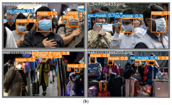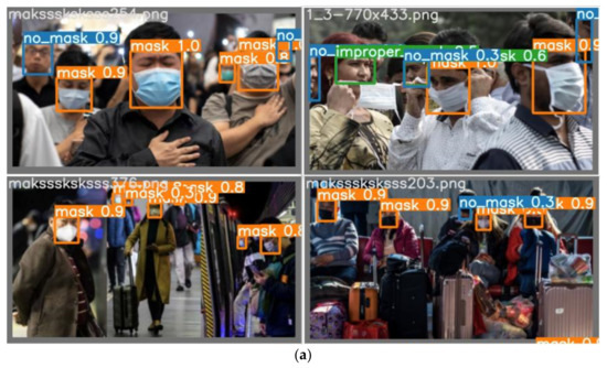 In this paper, comparison experiments are completed based on the face mask dataset to verify the accuracy of the YOLOv7 model and on the attention mechanism proposed above. There are a total of 1420 photos in the dataset: 990 photos for training, 136 photos for testing, and 294 photos for validation. The experiments’ hardware and software environments are consistent with the description in Part IV. Figure 8 shows the images before identification in the face mask dataset.