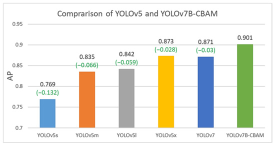 - As shown in Figure 10, when comparing the experimental results of the YOLOv5 series with the YOLOv7 model, it can be seen that in the YOLOv5 series only YOLOv5x, which has the largest number of parameters, has 0.2% more accuracy than YOLOv7 but, in contrast, the number of parameters and calculation of YOLOv7 is only half of YOLOv5x and it is twice as fast as the YOLOv5x model. The accuracy of the YOLOv7 model is 10.2%, 3.6%, and 2.9% higher than that of YOLOv5s, YOLOv5m, and YOLOv5l, respectively. It can be seen that the model performance is gradually improving with the development of the YOLO series. However, the YOLOv7B-CBAM model proposed in this paper also increases accuracy by 2.8% over the best of them in terms of accuracy, YOLOv5x, which proves the superiority of the model proposed in this paper in terms of accuracy.