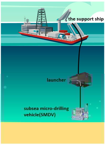 The SMDV is typically transported to the operation area by the support ship, and the launcher carrying the vehicle is lifted to a specific sea depth by a first-class armored umbilical cable. The vehicle is then released from the launcher to land in free fall by its gravity and transmit power and data to the launcher via the gravity-free cable, as depicted in Figure 1. Due to the influence of complex ocean conditions, support ship and launcher sway, and seafloor topography, the SMDV is released at a certain height above the seafloor in order to prevent damage. After landing on the substrate, the SMDV utilizes its crawler travel mechanism to traverse the seafloor in a specific region to conduct multipoint geological coring operations.