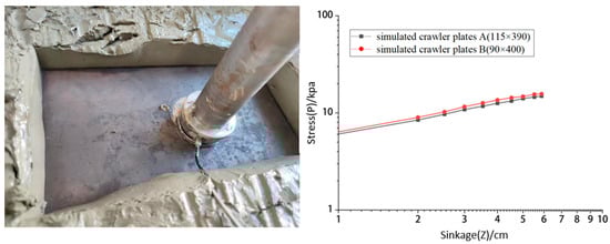 According to the actual aspect ratio of the SMDV, simulated crawler plates A and B (115 mm × 390 mm and 90 mm × 400 mm) were selected for data analysis. The compressive stress and sinkage coordinates of simulated crawler plate A and B were simultaneously taken logarithmically to obtain their corresponding double logarithmic curves of compressive stress-sinkage, as shown in Figure 3.