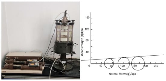 During test settings with a surrounding pressure of 50 kPa, 100 kPa, and 150 kPa, sediment specimens were subjected to triaxial undrained unconsolidated (UU) compression tests. Measurement of the shear strength of sediments under different environmental pressures and the relationship between the principal stress difference and axial strain could be determined. To calculate the sediment sample’s internal friction angle and cohesion parameters, it is necessary to plot the molar stress circle of the sample, establish a right-angle coordinate system with the normal stress as the horizontal coordinate and the shear strength as the vertical coordinate, plot the stress results under each level of enclosing pressure on the coordinate axis for the radius, and plot the envelope of the stress circle under each level of enclosing pressure (Figure 4). The longitudinal coordinate of the point of intersection with the y-axis represents the specimen’s cohesive force.