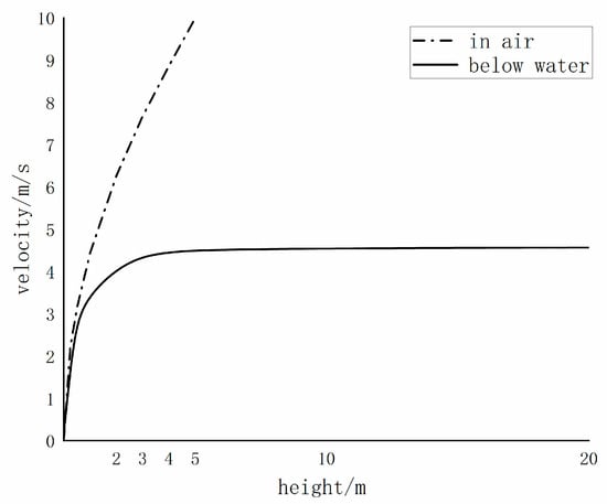 When the track lands on the substrate, the landing speed is crucial in SMDV fall impact. The same landing velocity in free fall, referred to as the equivalent release height in this paper, can be obtained by applying the principle of equal fall velocity and solving the underwater fall velocity using the formula above. Figure 5 illustrates the relationship between the SMDV’s landing velocity and the release fall height. The SMDV’s landing speed is substantially slower than the free-fall speed, as indicated in the figure, and this difference becomes more and more noticeable as the release height increases due to buoyancy, particularly water resistance. Due to the influence of water resistance, the release height has a decreasingly significant impact on the landing velocity. When the release height reaches 4 m, the SMDV experiences zero vertical acceleration and reaches its maximum and stable falling velocity. The simulation software can apply this method to simulate the effect of hydrodynamic action on SMDV.