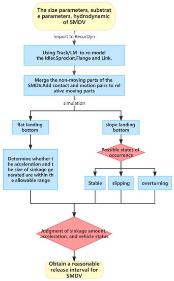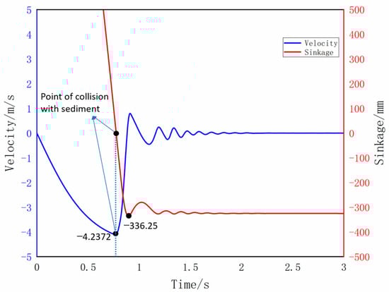 This study examines the center of mass displacement and center of mass acceleration response of the SMDV to evaluate its security. The center-of-mass displacement of the SMDV corresponds to the sinkage of its impact on the subsea substrate, which can be used to analyze whether it affects subsequent driving. The center-of-mass acceleration of the SMDV can be used to analyze the impact resistance of the instrumentation in the SMDV, and Figure 6 depicts the flowchart of the simulation method. Regarding a vehicle lowered from a height of 2 m onto a flat substrate surface, the simulation analysis of the substrate impact of the SMDV is performed, and the results are depicted in Figure 7, Figure 8 and Figure 9.