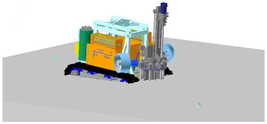 The SMDV primarily consists of a core extraction mechanism, crawler travel mechanism, power and control device, and other components, as shown in Figure 2; its structural parameters are shown in Table 1. This paper uses the MBD analysis software RecurDyn to model and analyze the SMDV, which adopts the theory of relative coordinate system equations and a fully recursive algorithm, and is suitable for solving large-scale and complex contact dynamics problems.