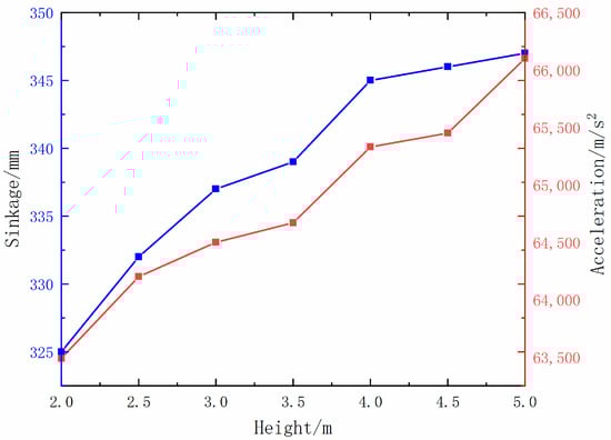 To observe the effect of the release height of the SMDV on its subsidence and impact acceleration, simulation experiments of the SMDV at 2–5 m release height were conducted in RecurDyn software, which was set up with the equivalent height of the free-fall equivalent to obtain the subsidence (stable value) and impact acceleration (maximal value) of the SMDV at different release heights, as illustrated in Figure 10. As shown in the graph, as the SMDV’s release height increases, its lowering volume and impact acceleration increase approximately linearly, consistent with the upward trend of the SMDV’s landing speed.