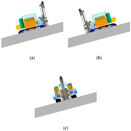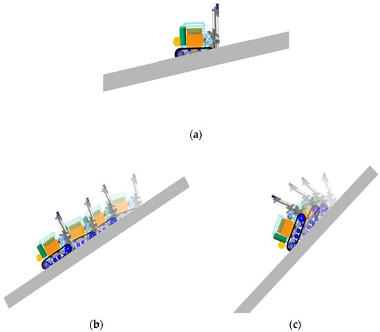 The complex topographic conditions of the deep seabed generally require SMDV to be able to land and travel on an inclined substrate surface. RecurDyn(V9R4) software was used to create a sloping surface with angles ranging from 0 to 45 degrees, and the SMDV was evaluated for its ability to anchor on the seabed under various release heights of 2–5 m. The forward, backward, and lateral landing modes of the SMDV are taken into account in the simulation experiments, as shown in Figure 11, because the different orientations of the SMDV landing change the spatial relationship of its center of mass concerning the inclined surface and the attitude response of the SMDV after landing.