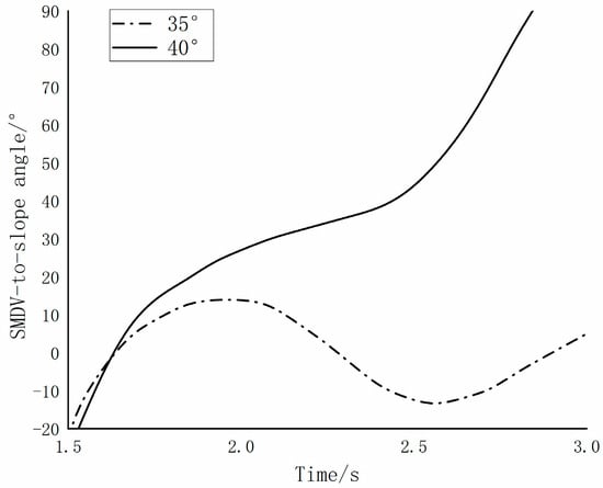 When the landing substrate is flat, the SMDV center of mass displacement, velocity, acceleration, and the angle between the SMDV and the substrate surface tend to be stable. When the substrate is inclined, the SMDV is unstable after landing due to the change in the spatial relationship of the center of mass concerning the inclined surface. During the simulation process, it was found that with the increase of the angle of the inclined plane, three states of stabilization, slippage, and overturning may occur after the SMDV lands on the substrate, as shown in Figure 12. When the slope angle is 35 degrees, the SMDV-to-slope angle after landing is not stable to 0 but exhibits periodic changes, and the corresponding SMDV speed component along the slope is not 0 but exhibits periodic changes over time; however, when the slope angle is 40 degrees, the SMDV-to-slope angle after landing is not stable to 0 but exhibits larger and more significant increases. The corresponding SMDV speed component is not 0 but increases to be larger and larger over time (Figure 13). When the slope lands on an angle of 35 degrees, the SMDV slides, and after landing at 40 degrees, the SMDV overturns. This paper defined the ultimate slipping angle as the maximum slope angle at which the SMDV becomes ensnared in sediment without slipping and the ultimate overturning angle as the maximum slope angle at which the SMDV is located on the slope without overturning.