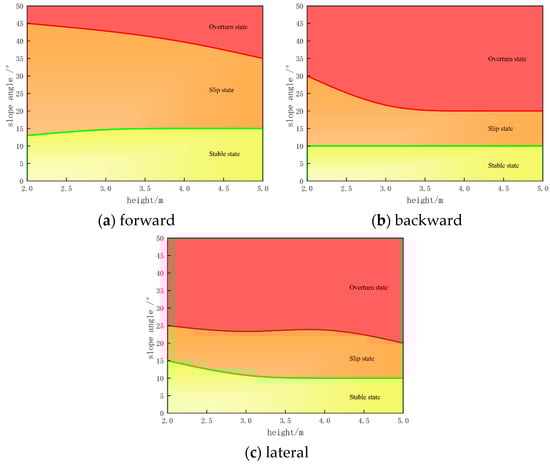 At first, the release height was established, the SMDV was divided into three different landing directions, and the slope was gradually increased. Ultimately, the SMDV’s attitude post-landing was observed in dynamic simulation. From this, it is possible to estimate the slope of the incline corresponding to the SMDV’s stable, slipping, and overturning state when it falls under a certain release height. This is the ultimate slipping angle and ultimate overturning angle of the SMDV. This means that the SMDV’s landing substrate is slipping when the slope is greater than the ultimate slipping angle but less than the ultimate overturning angle, stable when the slope is less than the ultimate slipping angle, overturning when the slope is greater than the ultimate overturning angle, and slipping when the slope is greater than the ultimate slipping angle but less than the ultimate overturning angle. As a result, for each release height, the ultimate slipping angle and the ultimate overturning angle corresponding to the three landing directions can be determined. The ultimate slipping and overturning angles under various release heights are connected into curves to obtain the relationship between the state of SMDV and the release height and slope under the three landing directions, as shown in Figure 14.