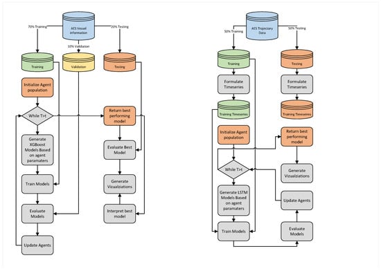 For the classification experiment, metaheuristics were allocated a population size of 10, allowed 10 iterations, and tasked with optimizing XGBoost hyperparameters and improving outcomes. Parameters were chosen for optimization due to their high influence on model performance. The parameters and their respective ranges included: learning rate , min child weight , subsample , colsample by tree , max depth , and gamma . The dataset used for classification was divided, with an initial 70% used to train the models, the following 10% for validation, and the final 20% for testing. A flowchart is shown in Figure 2 left.