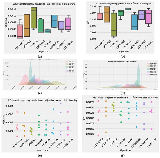The research presented in [] proposed ant-lion optimization of flight trajectory-based LSTM predictions. The results indicated improvements in terms of the convergence speed and accuracy. The authors in [] applied a PSO-based algorithm to optimize a support vector machine for regression (SVR), used for urban environment vehicle trajectory prediction based on a global positioning system (GPS) and onboard diagnostics (OBD) integration (GOI). SVR parameter selection was the subject of optimization using the swarm metaheuristic. The paper in [] employed AIS sensor data for SVR model training with adaptive chaos differential evolution. AIS data included the ship’s speed, course, time stamp, longitude, and latitude. Optimization was performed for parameter optimization, with the goal of convergence and prediction improvement. A system for early warning in maritime navigation was proposed by Suo et al. [] with the employment of AIS data, alongside a GRU prediction-based model optimized using a density-based spatial clustering of applications with noise (DBSCAN) algorithm. Vessel trajectories were the prediction object, which was compared to the performance of LSTM on the same problem. The accuracy was near the accuracy of the LSTM, but improvements were noted for the computational cost.