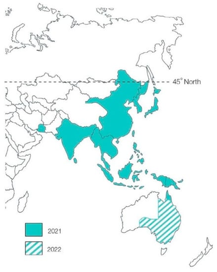 - World Health Organization. Japanese Encephalitis—Australia. Available online: https://www.who.int/emergencies/disease-outbreak-news/item/2022-DON365 (accessed on 29 January 2023).