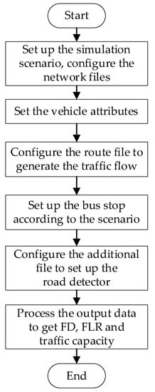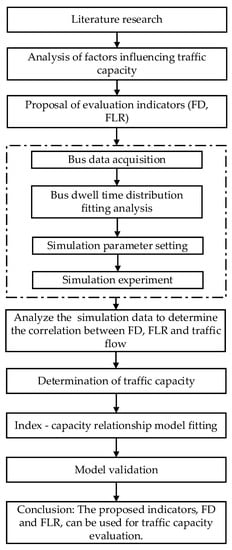 The rest of this paper is organized as follows. In Section 2, two important evaluation indexes called failure duration (FD) and forced lane-changing rate (FLR) are explored by analyzing the traffic capacity of bus stops. Section 3 proposes the method and experimental schemes of traffic flow simulation near a bus stop under a CAVs environment. A correlation between FD, FLR, and traffic flow rate is discussed in Section 4. The relationship function model is fitted in Section 5 to analyze the effectiveness of FD and FLR in evaluating traffic capacity and the effectiveness of FD and FLR in predicting the traffic capacity of bus stops under the CAVs environment. In Section 6, the experimental results and the differences with related methods are discussed. Section 7 summarizes this paper. Figure 1 illustrates the research process of this study.