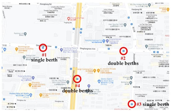 During the morning peak hours (around 7:30–8:30), bus dwelling data were collected by video detection in Gulou District, Nanjing, Jiangsu, which spans working days from 19 October 2021, to 23 October 2021. The dataset involves four bus stops (see their geographic locations in Figure 3); of that, the No. 1 bus stop and No. 3 bus stop have a single berth, and the No. 2 bus stop and No. 4 bus stop have double berths. No. 1 bus stop and No. 4 bus stop are bus bay stops and No. 2 bus stop and No. 3 bus stop are curbside bus stops. These four bus stops keep considerable distances from intersections, which can neglect the interaction between the bus stop and nearby intersections. Table 1 shows the details related to the four bus stops.