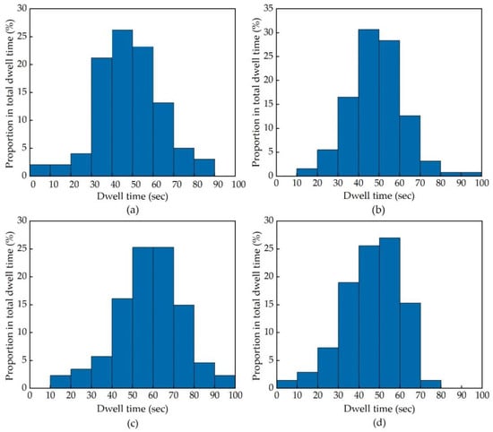 The dwell time of all buses serving at the four bus stops is extracted from the collected data, and the proportion of each dwell period to the total dwell time is depicted in Figure 4. As can be seen in Figure 4, the dwell time of the four bus stops is mainly distributed from 30 to 80 s, and the total dwell time of the No. 4 bus is longer than that of the other three stops, which is close to the square with large traffic flow.