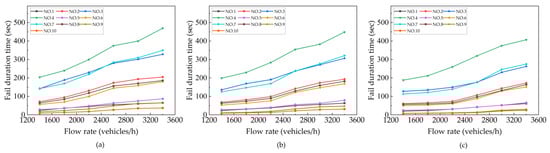 It can be seen from the figure that the fitting accuracy of the above FD and FLR fitting models for the traffic capacity of the four stations is between 0.85 and 0.95, and the fitting effects are good, so the fitting models can be considered effective. The results reveal a significant second linear fitting relationship between both failure duration and capacity and forced lane-changing and capacity, which further verifies that this index can better reflect the impact on the capacity of the road near the stop.