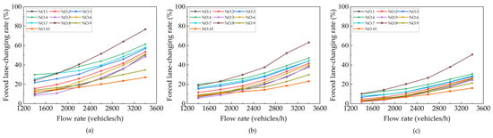 The critical position of lane change is recorded as LP. A vehicle must start changing lanes before the critical position. As explained in Section 2.1, forced lane change is defined as changing lanes after the critical position of the lane change. FLR is defined as the ratio of forced lane change times to total lane change times. The FLR can be calculated by: