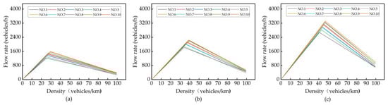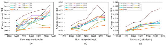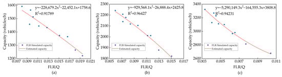 Lastly, the FLR data at a 0% penetration rate and the capacity at 50% and 100% penetration rates from all ten scenarios were selected to establish a functional relationship expression between FLR and CCAV. The fitted functional expressions and goodness of fit are presented in Table 15, and the corresponding fitting graphs are displayed in Figure 15.