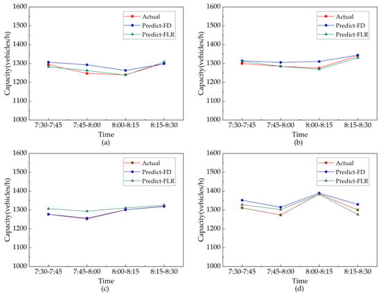The measured values and observed values of traffic capacity around four bus stops: (a) no. 1 bus stop; (b) no. 2 bus stop; (c) no. 3 bus stop; (d) no. 4 bus stop.