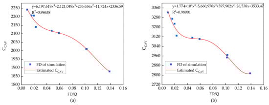 Initially, we investigated the relationship between capacity and penetration rates (0%, 50%, and 100%) for all scenarios. After comparing various common functional models, we found that a quadratic polynomial function could better describe the relationship between CCAV and CHV. Thus, a fourth-degree polynomial function was chosen to fit the numerical relationship between FD/Q–CCAV and FLR/Q–CCAV.
