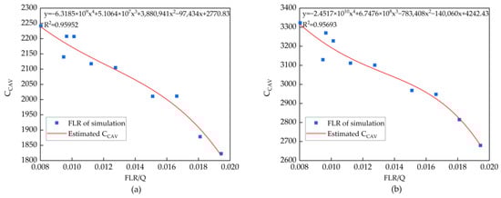 The FLR–CCAV relationship fitting curve under different Ra. (a) Ra = 50%; (b) Ra = 100%.