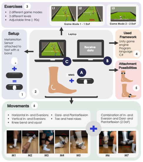 - Galli, J. Analysis, Design and Prototypic Implementation of a Serious Game for Rehabilitation and Prevention of Ankle Injuries. Master’s Thesis, Faculty of Informatics at the Vienna University of Technology, Vienna, Austria, 2022. [Google Scholar]
