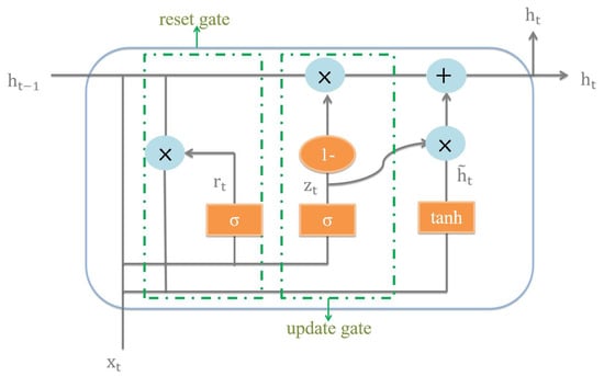 RNN is a special neural network structure. Because of its memory function of historical information, it has unique advantages in dealing with time-series problems and has received great attention in recent years. However, a problem that cannot be ignored in traditional RNN is the disappearance and explosion of the gradient. LSTM, as an upgraded version of RNN [33], can better alleviate the problems of gradient disappearance and gradient explosion by turning gradient multiplication into gradient addition. By merging the forget gate, input gate, and output gate into a reset gate and update gate, GRU, as depicted in Figure 1, makes further improvements on the basis of LSTM performance [34]. GRU can achieve a similar prediction performance to LSTM but with a simpler structure and fewer parameters, which greatly improves the training speed.