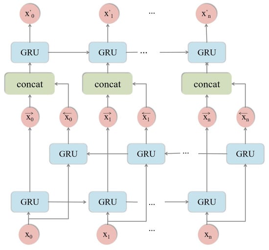 The standard GRU network only considers the forward influence of historical information on future time series, overlooking the potential implicit information that may exist during network communication. To address this limitation, the BiGRU [35] model is introduced as a modification to the conventional GRU. By processing sequences of observations from both forward and reverse directions, as illustrated in Figure 2, the BiGRU network gains additional insights into the sequence. The primary objective of this approach is to extract maximal information from a given subsequence of observations, thereby providing an enhanced reference value for RUL prediction. Consequently, this paper adopts the BiGRU model in order to achieve this goal.