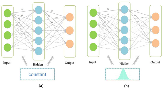 The Bayesian neural network is a powerful uncertainty framework [36]. It introduces uncertainty into a neural network by changing the constant weights (W in Figure 3) in the traditional neural network into probabilistic weights that obey a certain distribution; the structural comparison diagram is shown in Figure 3.