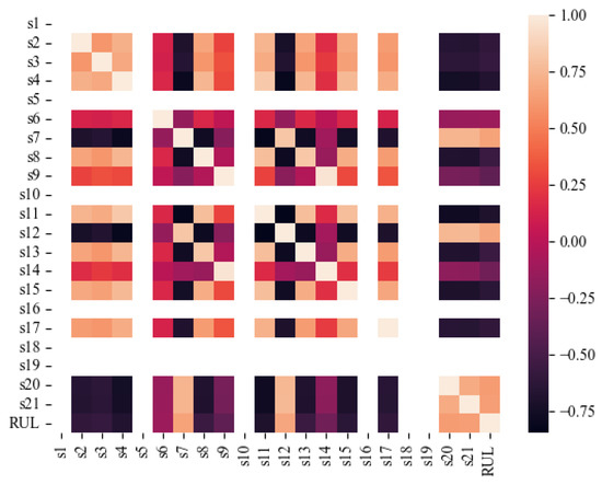 We also conduct correlation analysis between the sensor data and RUL. As can be seen from Figure 7, some sensor data have no correlation information, so we combine the results of the data visualization in Figure 6 and finally decide to reject the data from sensors 1, 5, 6, 10, 16, 18, and 19. We also found that some sensor data show a high correlation, indicating the existence of some redundancy features. It is necessary to extract the main features.